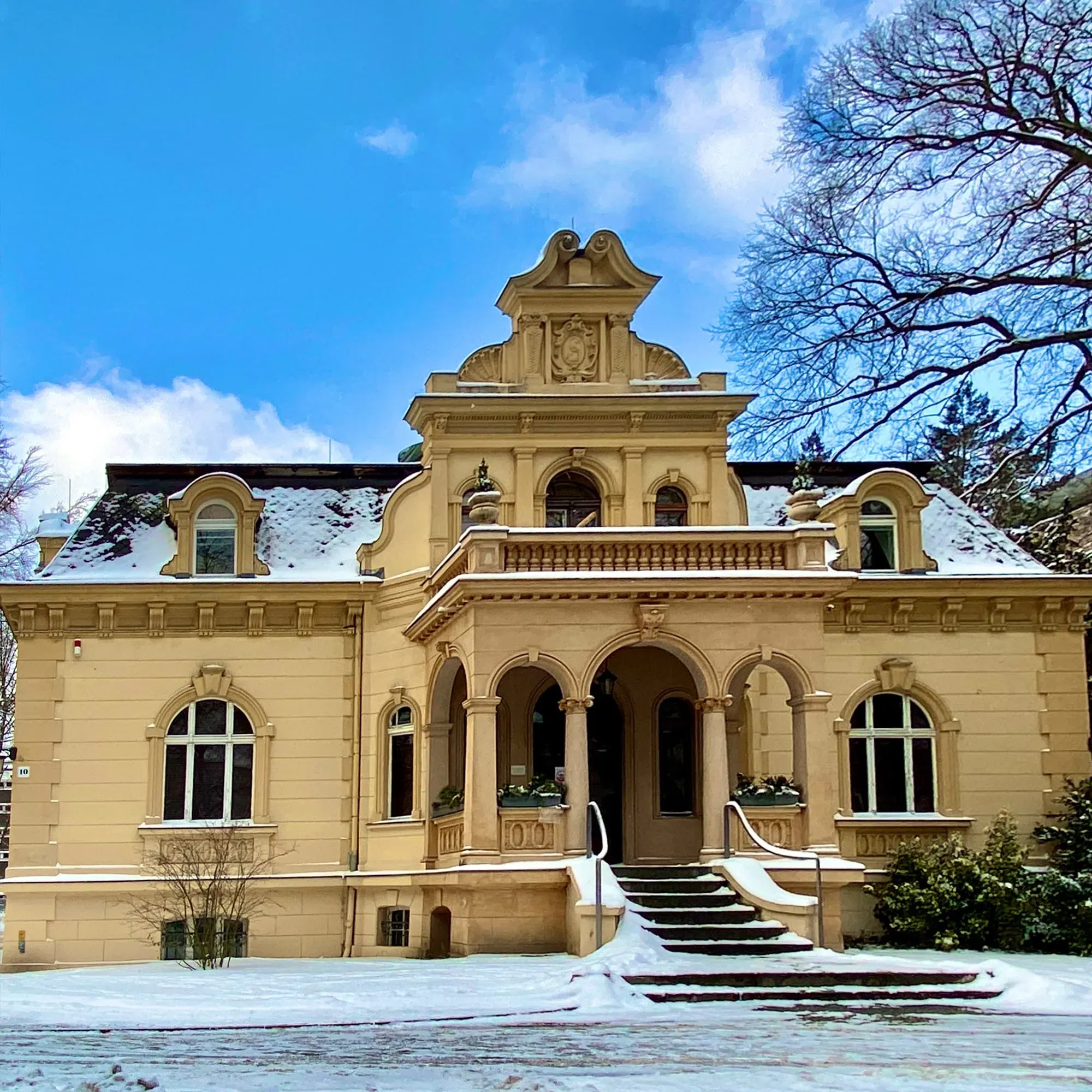 - Die burgähnliche Fassade ist mit den Türmchen und dem Wappenschmuck ein echter Hingucker.