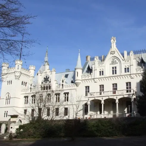 - Zu der Wasserburg im gotischen Stil gehört eine idyllische Parkanlage.
