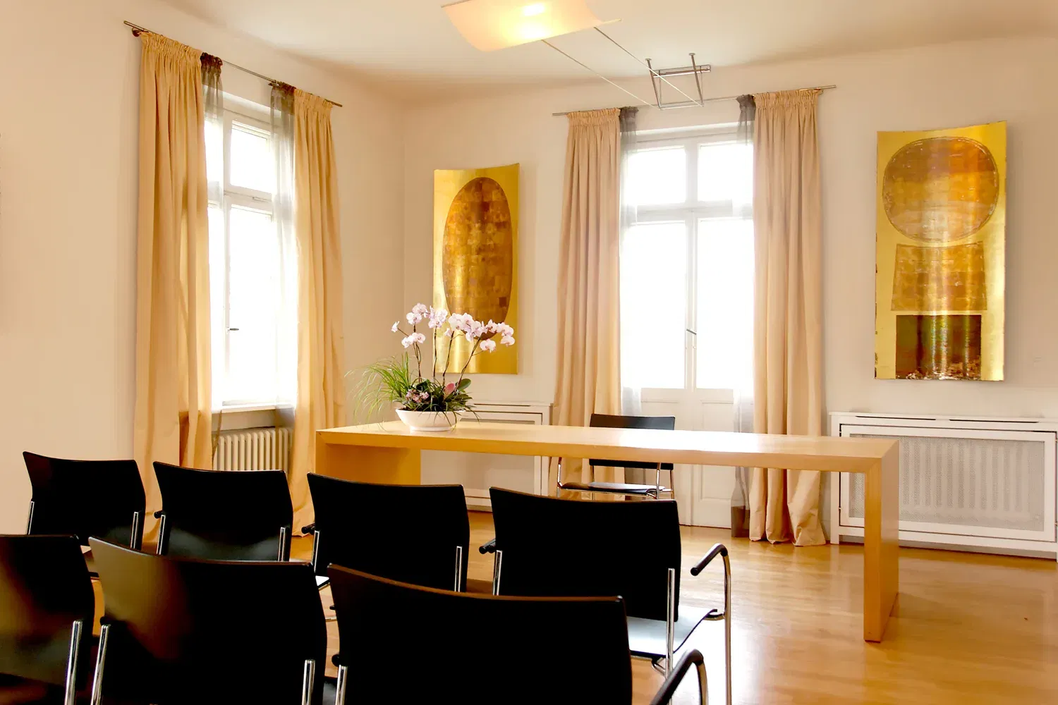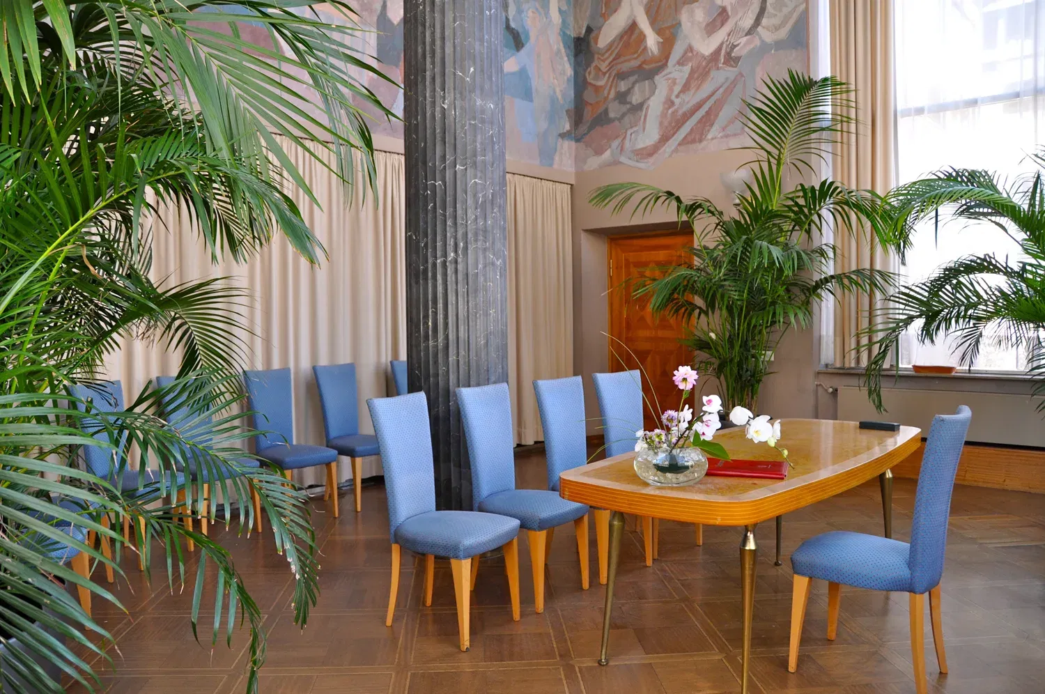 - Der kleine Saal mit Wandgemälden bietet Platz für insgesamt elf Personen.
