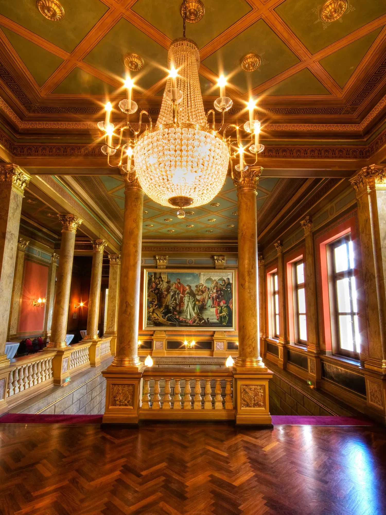 - Getraut wird im Reihersaal unter Kronleuchter und goldener Deckenverzierung.