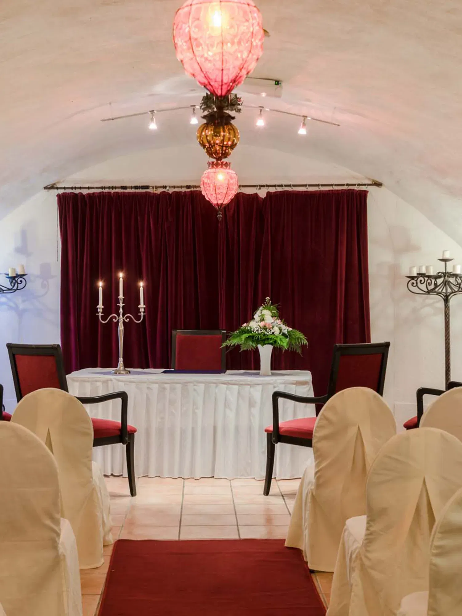 - Die standesamtliche Trauung wird im malerischen „Freixenet Saal“ durchgeführt und bietet Platz für bis zu 50 Personen.