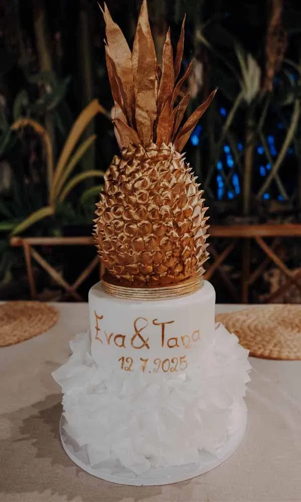 Ein Hauch von Tropen zieht sich durch den Sweet Table und setzt gezielte Akzente: Kleine, goldene Ananas-Sweets ergänzen hier das Tortenmotiv und bringen eine frische, exotische Note in das Dessertkonzept der Hochzeit. Die unterste Schicht der Hochzeitstorte ist mit zarten, weißen Rüschen verziert und verleiht dem Design eine elegante Leichtigkeit. Die mittlere Ebene zeigt eine kunstvoll gestaltete Weltkarte, auf der all jene Länder markiert sind, die das Paar bereits gemeinsam bereist hat – eine persönliche Geschichte, die sich auch im Sweet Table widerspiegelt. Als Abschluss thront eine vollständig goldene Ananas auf der Torte. Im Inneren ist sie mit Vanille-Biskuit, feiner Pistaziencreme und hausgemachter Orangenmarmelade gefüllt, während die filigranen Blätter aus Esspapier gefertigt sind.