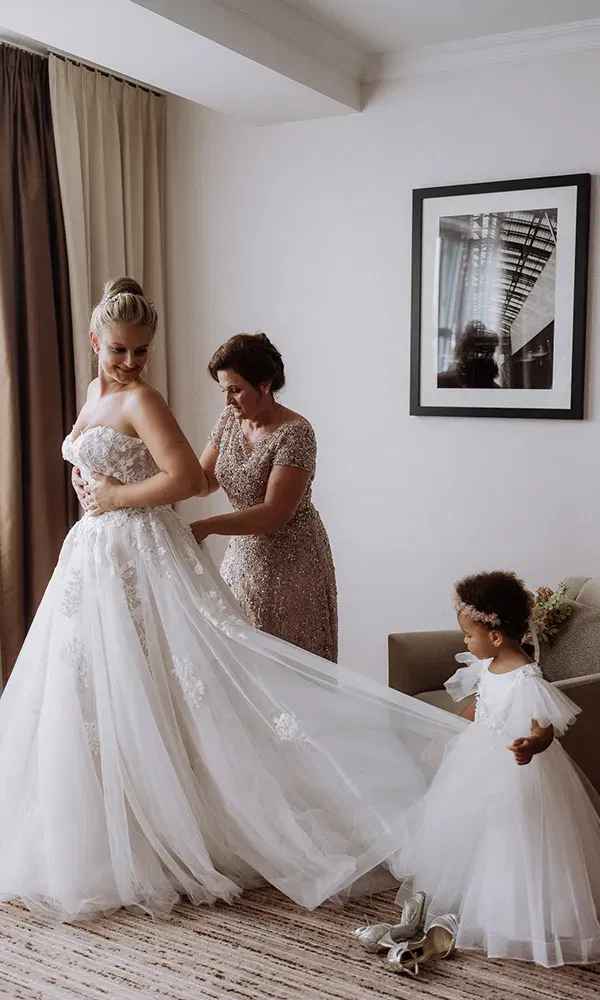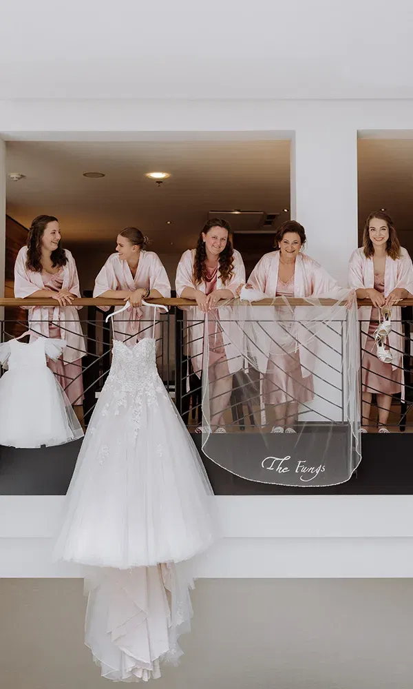 Die Nacht vor dem großen Tag verbrachte das Brautpaar in getrennten Zimmern im Marriott Köln. Gegen acht Uhr morgens kam Stylistin Elke Pflips ins Brautzimmer und kümmerte sich neben der Hauptperson auch um deren Mutter und Schwester. Das weitere Team Bride wurde parallel von Elkes Kollegin gestylt. „Wir hatten so eine tolle Zeit beim Getting-ready. Auch meine kleine Tochter war mit vollem Elan dabei“, freut sich Nicol. Vor dem Aufbruch zur Trauung fand der First-Look in einem separaten Hotelraum statt. „Meine Frau und meine Tochter in ihren tollen Kleidern zum ersten Mal zu sehen, war sicher einer der emotionalsten und schönsten Momente des Tages“, schwelgt Stephen in Erinnerungen. Nach dem emotionalen Highlight fuhren Braut und Bräutigam getrennt zur katholischen Kirche St. Gereon.