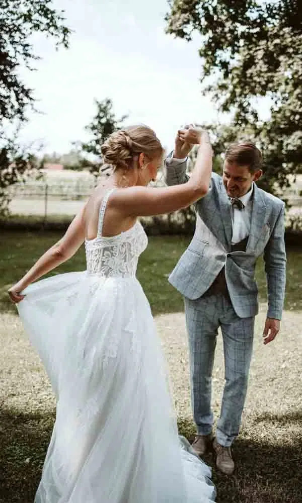 „Ich hatte mir im Vorfeld eigentlich etwas ganz anderes vorgestellt“, schmunzelt Sophie. Geplant war ein Brautkleid im schlichten Clean-Chic-Stil. „Geworden ist es dann ein Kleid aus Spitze – mit Korsage, Herzausschnitt und einer ziemlich langen Schleppe“, erzählt sie lachend. Auch Reinhard wurde fündig: In einer kleinen Boutique entdeckte er im zweiten Anlauf seinen Anzug. „Ein echtes Einzelstück“, wie er betont.
