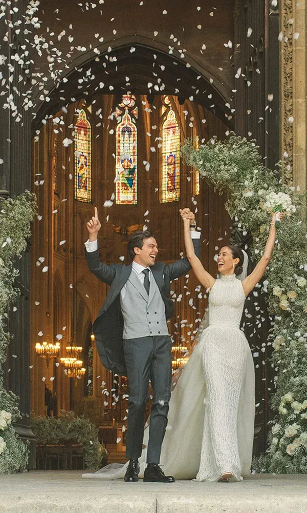 Die kirchliche Trauung folgte am Samstag und fand in der beeindruckenden Basilika Sainte-Clotilde statt, einer neugotischen Kirche aus dem 19. Jahrhundert. Der Einzug begann mit den Akkorden zu „Halleluja“, vorgetragen von einem Jungen- und Mädchen-Chor. Diesen Programmpunkt hatte Anne-Marie heimlich für ihren Mann vorbereitet. Der Bräutigam trug beim Einzug ein dunkelgraues Jackett, eine zweireihige perlengraue Weste mit Revers-Kragen von Canali, ein weißes Hemd aus Baumwollpopelin und eine Seidenkrawatte von Yusty. Begleitet wurde er von seiner Mutter Rosa Clará in einer Kreation aus magentafarbenem Seidenkrepp, die mit Edelsteinen verziert war. Die Outfits der Trauzeugen wiederum waren farblich perfekt mit den Kleidern der Brautjungfern abgestimmt. Diese trugen Kleider von Rosa Clará aus rosafarbenem Seidenmull und mit modischen Details wie Cut-outs und Drapierungen.