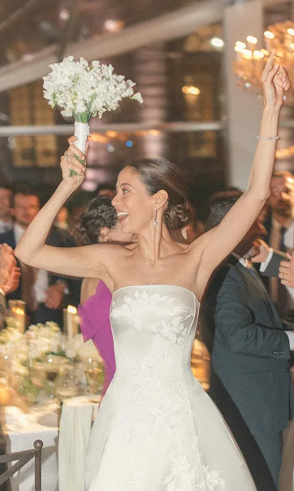 Alles begann freitags mit einer Vorfeier auf einem Boot auf der Seine. Die Braut entschied sich für ein kurzes Kleid in sanfter Perlenfarbe mit Mikroperlen und Silbergarn, abgerundet mit Kristallfransen: ein umwerfendes, ärmelloses Design mit U-Boot-Ausschnitt, das an den Stil der 20er-Jahre und den Gatsby-Glamour erinnert.