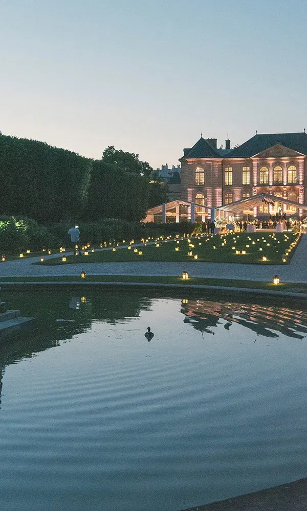 Nach der kirchlichen Trauung wurde das frisch getraute Paar bejubelt. Der darauf anschließende Empfang fand nur wenige Gehminuten entfernt im Musée Rodin statt. Dort lebte der berühmte französische Bildhauer Auguste Rodin in seinen letzten Lebensjahren. Seine Skulpturen stehen in der großzügigen Gartenanlage des Rokoko-Palastes und geben diesem historischen Ort etwas Künstlerisch-Magisches. Wie ein weiteres Kunstwerk aus der Sammlung des Museums strahlte Anne-Marie Colling in ihrem zweiten Braut-Look. Ein bezauberndes, trägerloses Hochzeitskleid mit klassischer Silhouette und Tulpenrock. Das Modell wurde aus doppellagigem Duchesse-Seidensatin gefertigt und mit einem künstlerisch inspiriertem Blumen-Design sowie einem Hauch Goldstaub versehen. Abgerundet mit einem Tüll-Wateau im gleichen Design.