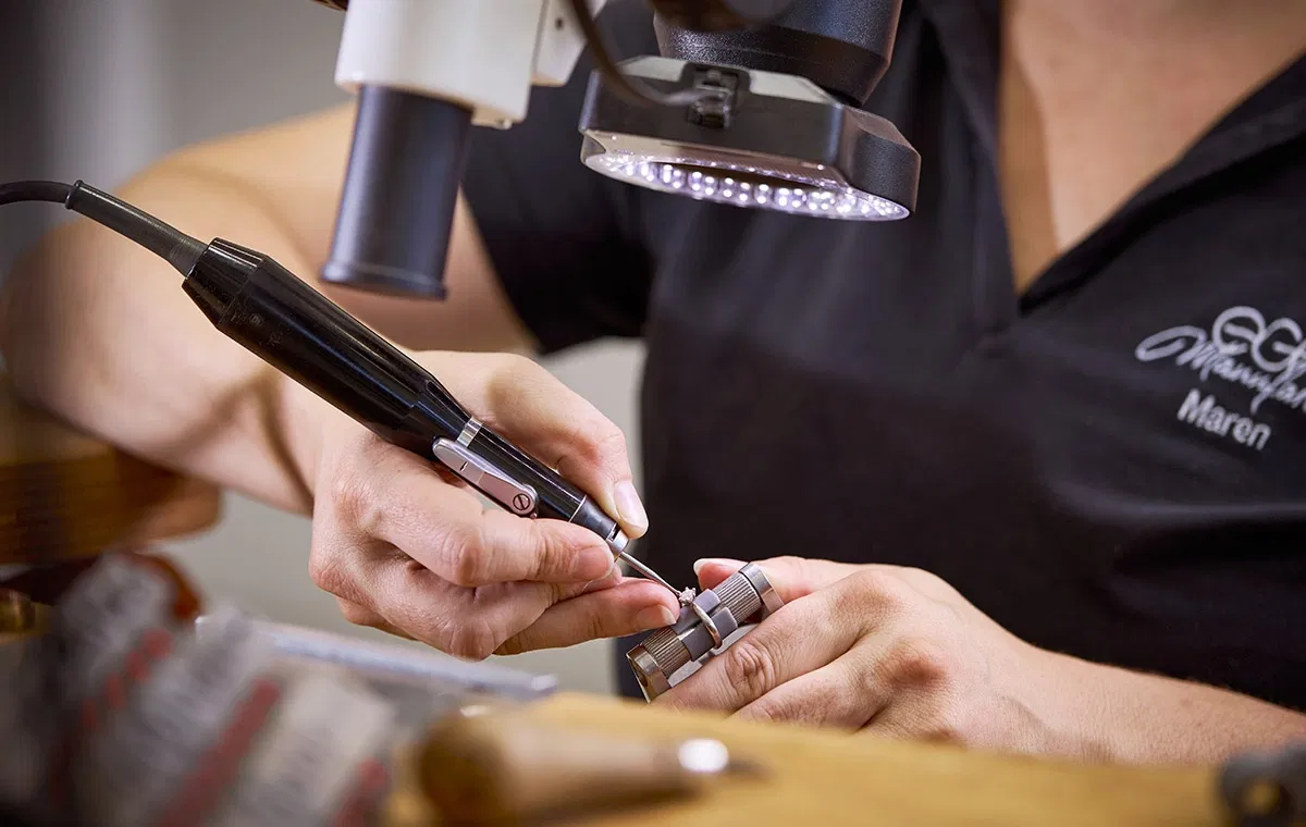 In der egf Manufaktur entsteht jeder Ring in echter Handarbeit. Mindestens zwanzig erfahrene Hände formen, prüfen, verfeinern und perfektionieren jeden einzelnen Schritt, bis aus einer Idee ein individuelles Unikat gewachsen ist.