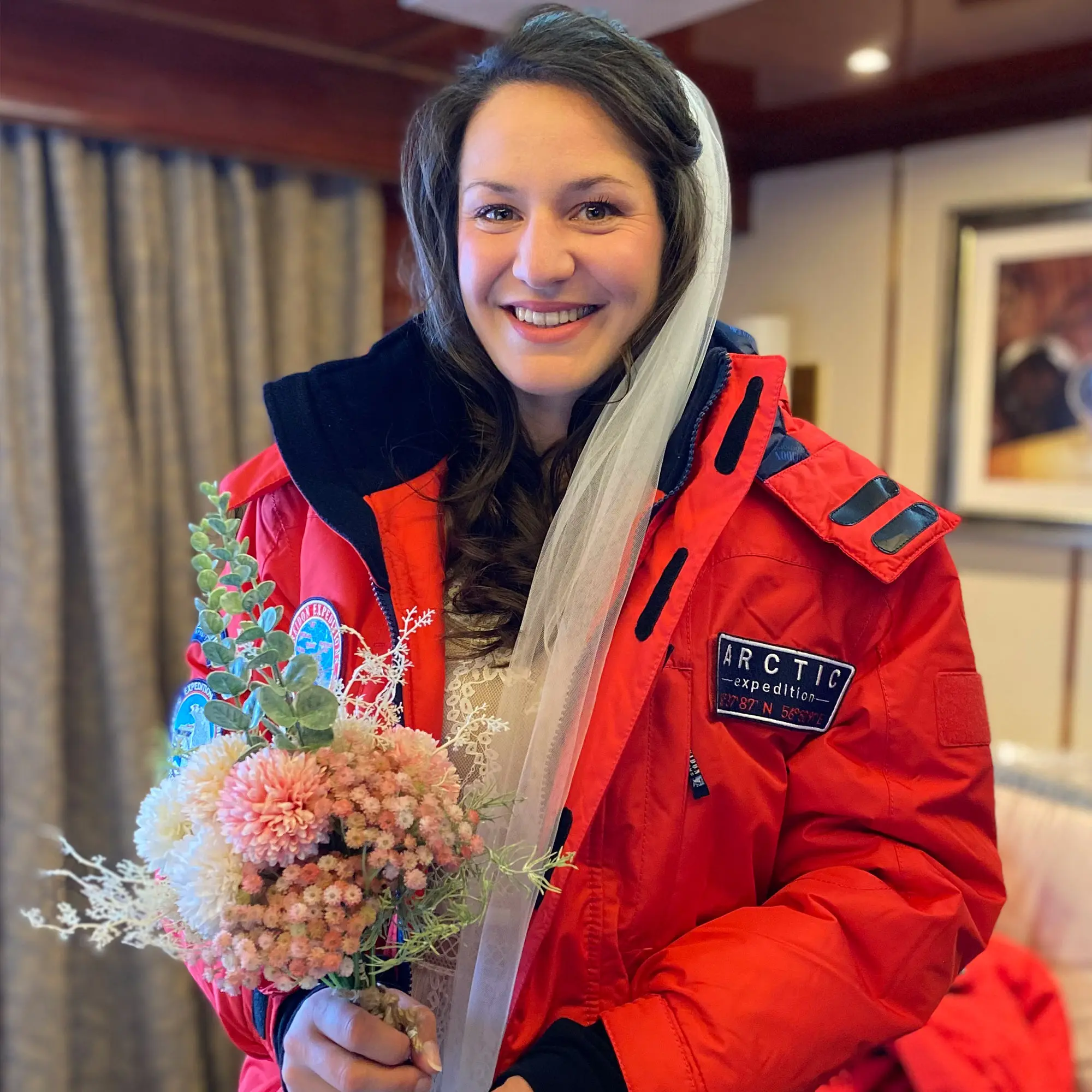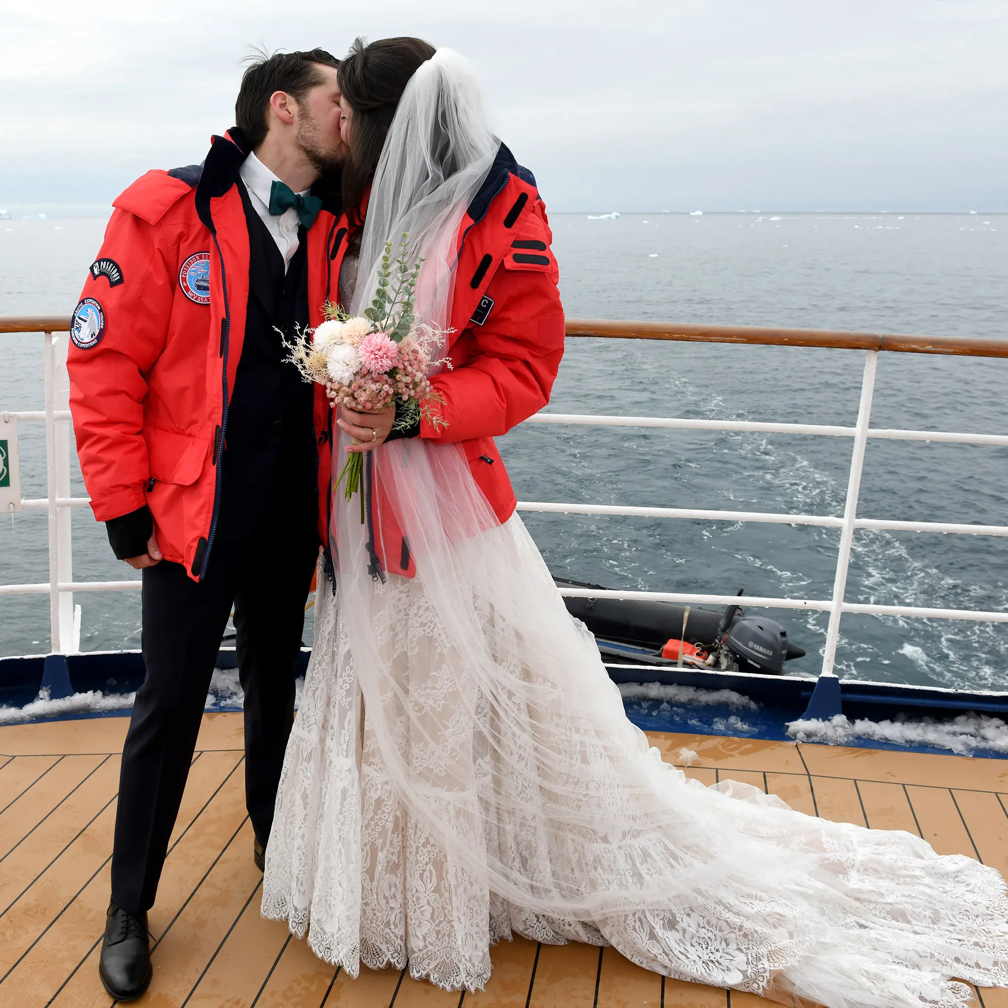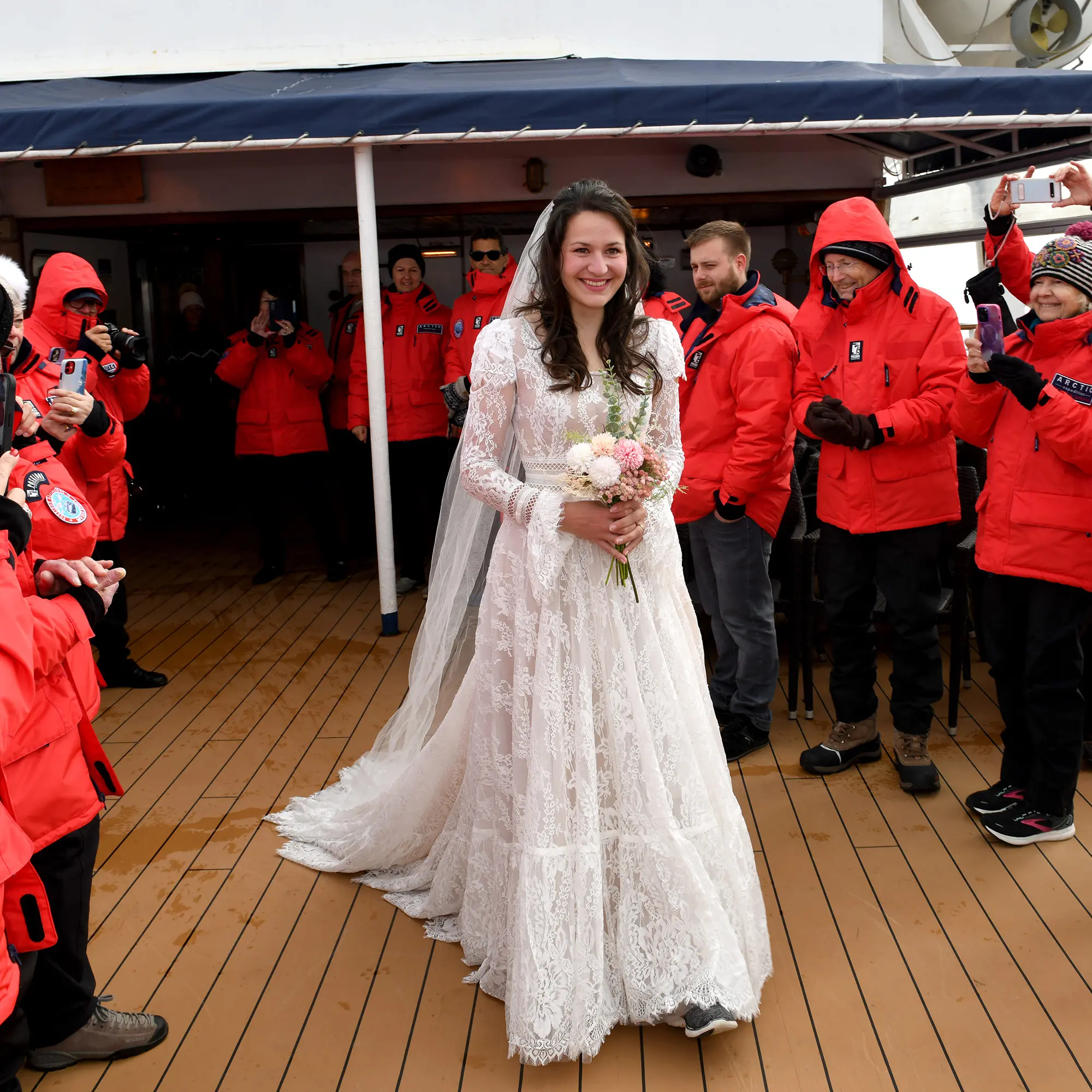 Mit klopfendem Herzen und zitternden Fingern umklammere ich meinen Brautstrauß. Vor mir liegt der Gang, der auf Deck 5 hinausführt. Die Tür am Ende öffnet sich wie von selbst. Ein leises Seufzen ertönt aus einem roten Meer. Unzählige Passagiere haben sich mit ihren Expeditionsjacken an Deck eingefunden, um der Zeremonie beizuwohnen. Und alle lächeln. Meine Trauzeugin flüstert noch “Schreiten!”, aber dieser Rat verhallt leider ungehört, als ich das Gesicht meines Verlobten an der Reling entdecke.