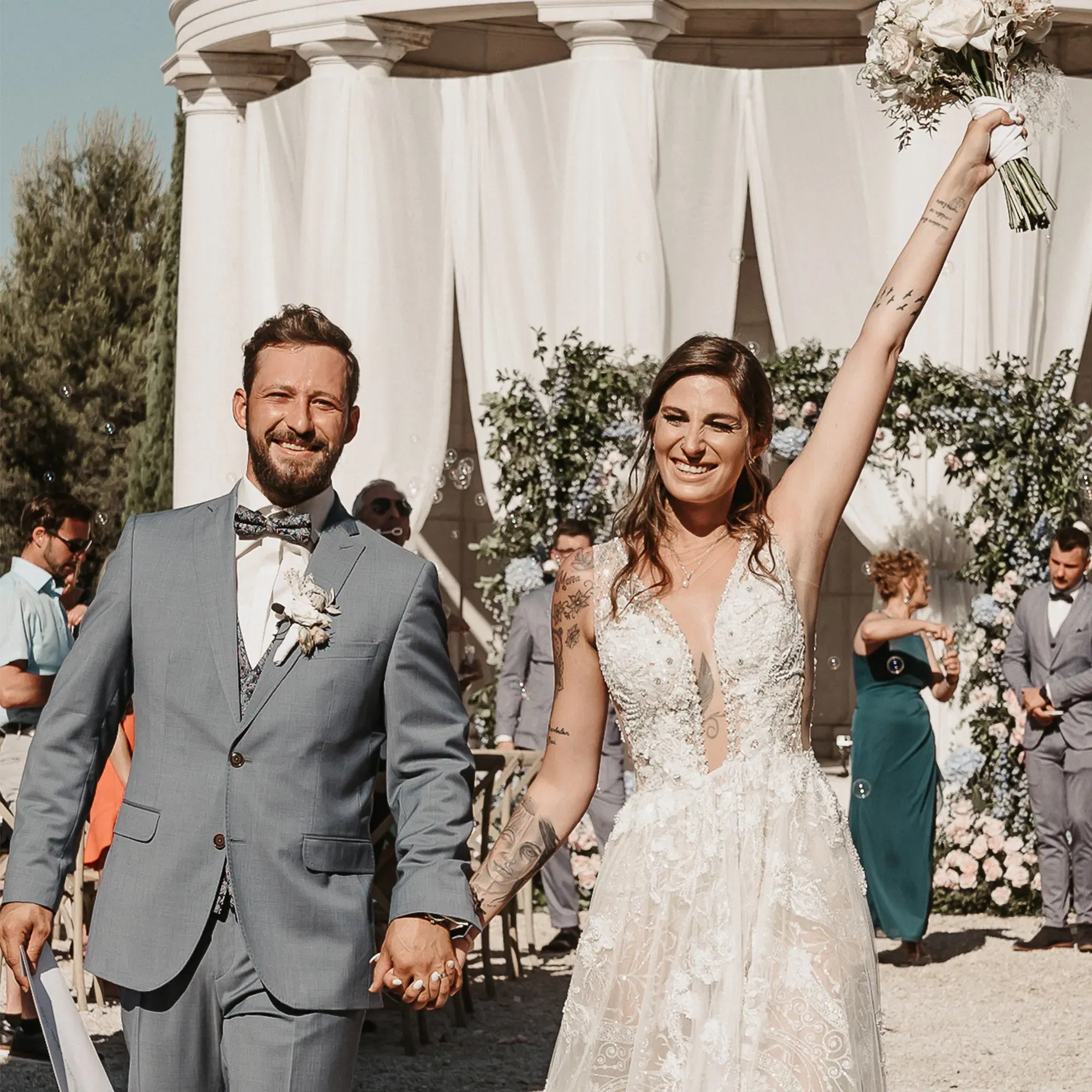 Viele Brautpaare entscheiden sich für eine Zeremonie unter freiem Himmel. Frische Luft und Sonnenstrahlen auf der Haut fühlen sich super gut an und lassen die Glückshormone nicht nur beim Brautpaar, sondern auch bei den Gästen tanzen. Ein kleiner Pavillon oder ein blumengeschmückter Traubogen im Hintergrund eignen sich gleichzeitig auch wunderbar als Fotomotiv.