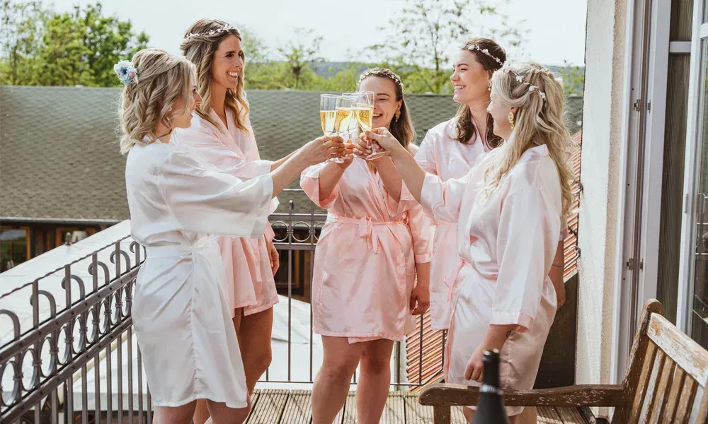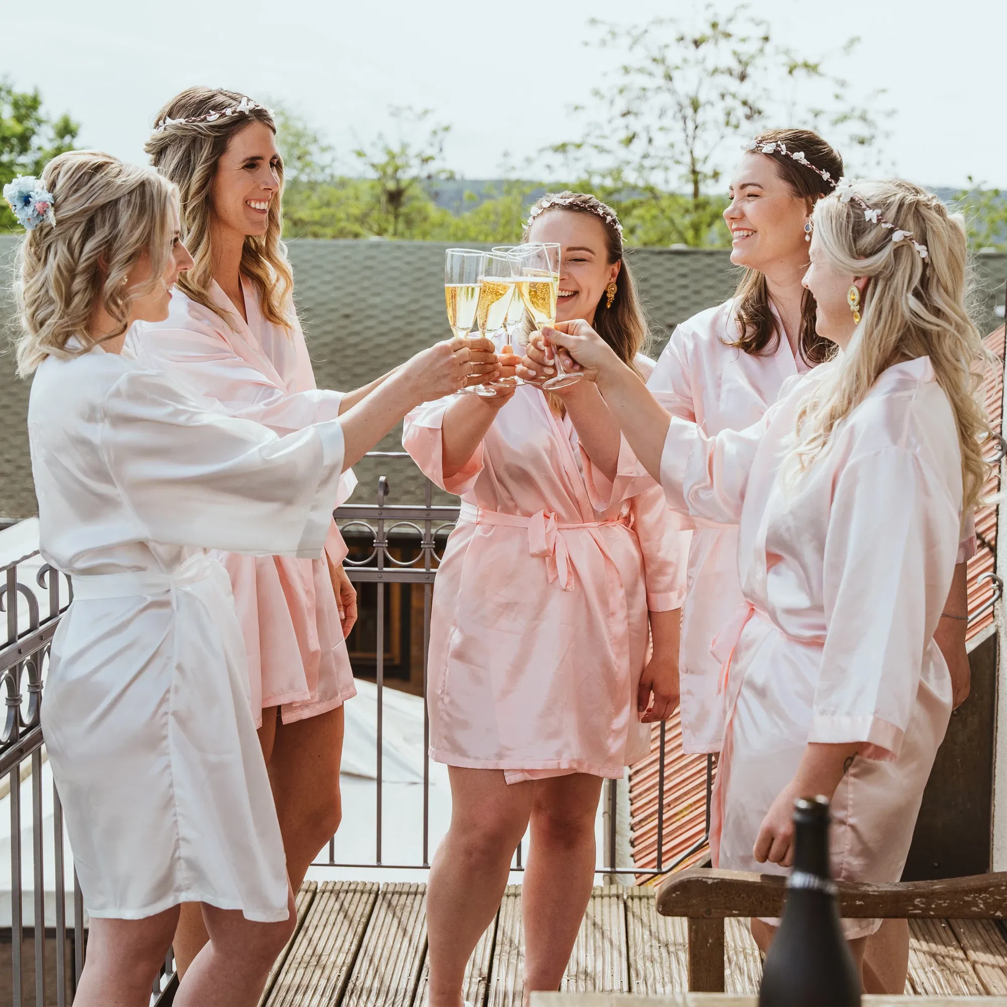 Braut und Freundinnen stoßen auf einem Balkon in Seidenroben mit Champagner an und feiern den Junggesellinnenabschied bei sonnigem Wetter.