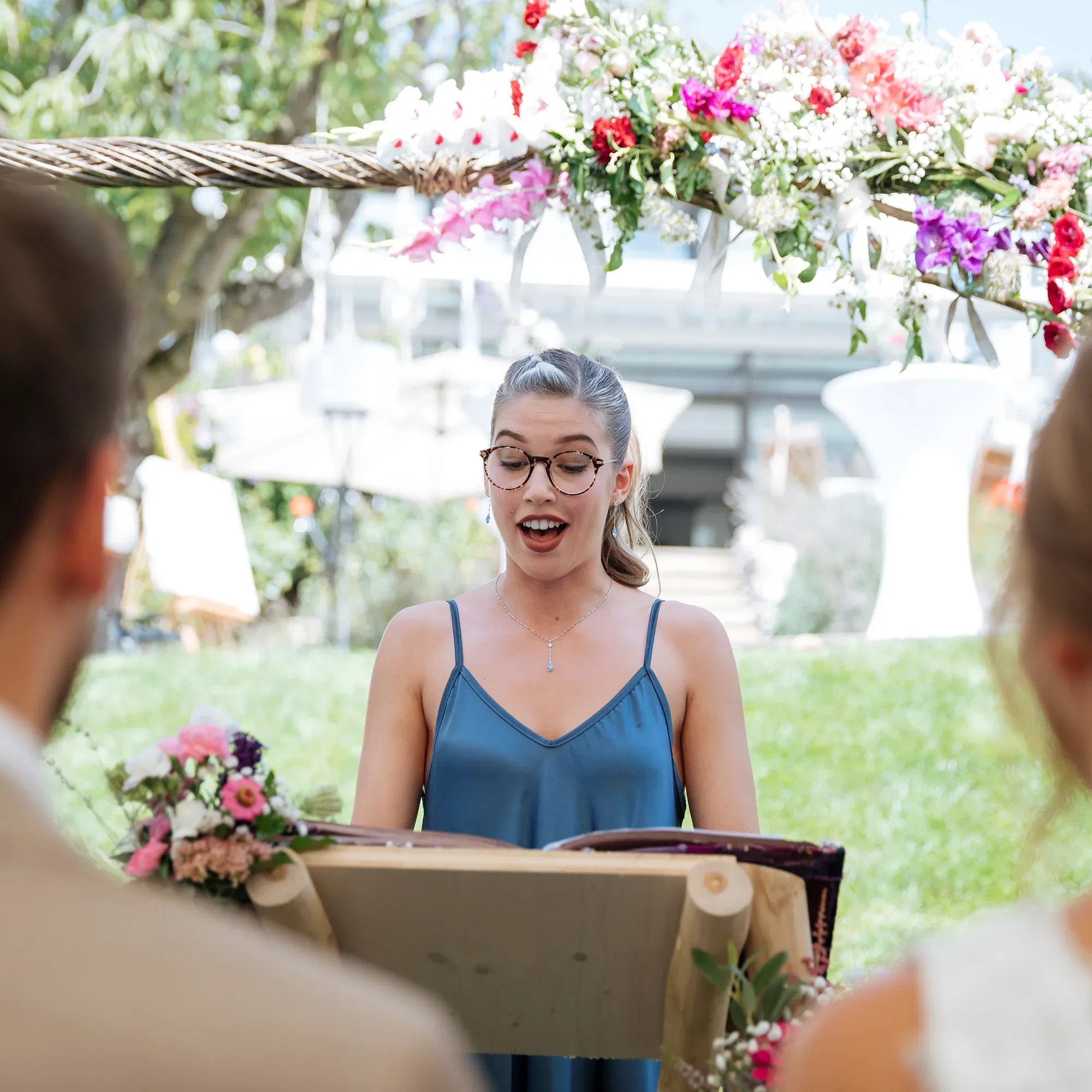„Eine große Rolle spielt das Ambiente. Neben ausreichend Sitzmöglichkeiten für eure Hochzeitsgäste, solltet ihr auch an einen Sonnenschutz denken. Freie Trauungen können bis zu einer Stunde dauern und da ist vor allem an heißen Sommertagen Schatten unglaublich wichtig.“