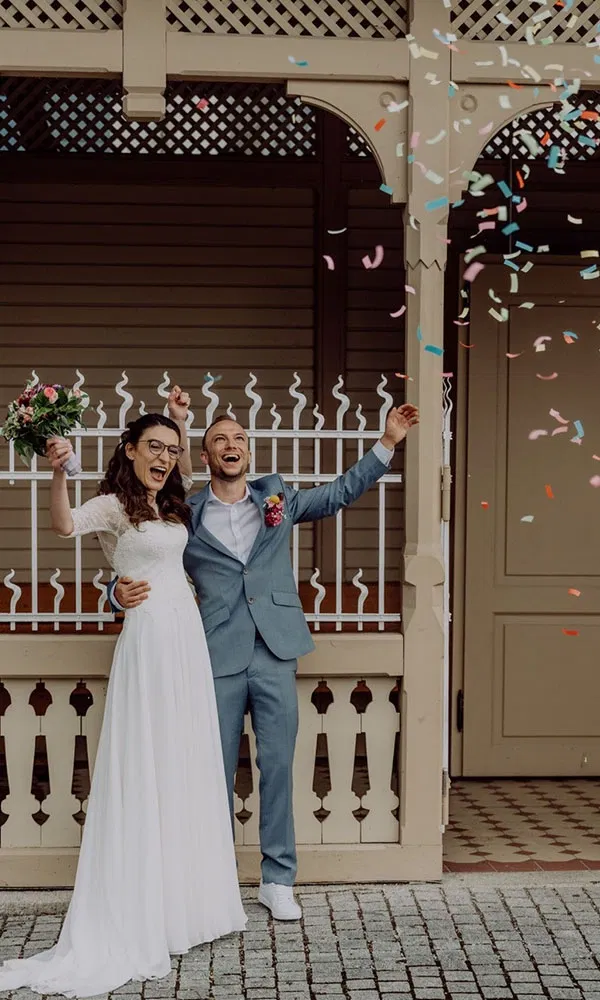„Ich habe meinen Strauß tatsächlich gegen die Decke geworfen“, erzählt Maria lachend. Der Hochzeitssaal war ein umgebauter Gewölbekeller mit eher niedriger Decke – und ihr Wurf fiel entsprechend etwas zu schwungvoll aus. Doch der Strauß machte eine elegante Kurve und segelte quer durch den Raum, bis eine Freundin ihn im richtigen Moment auffing.