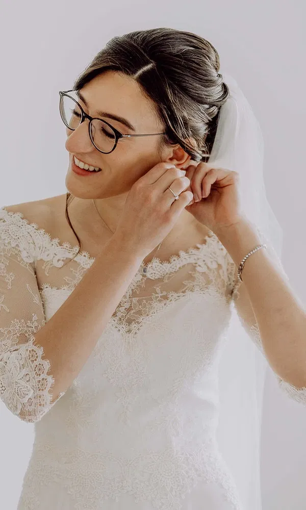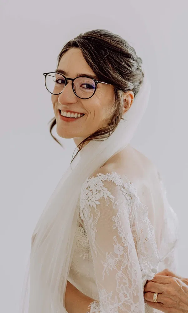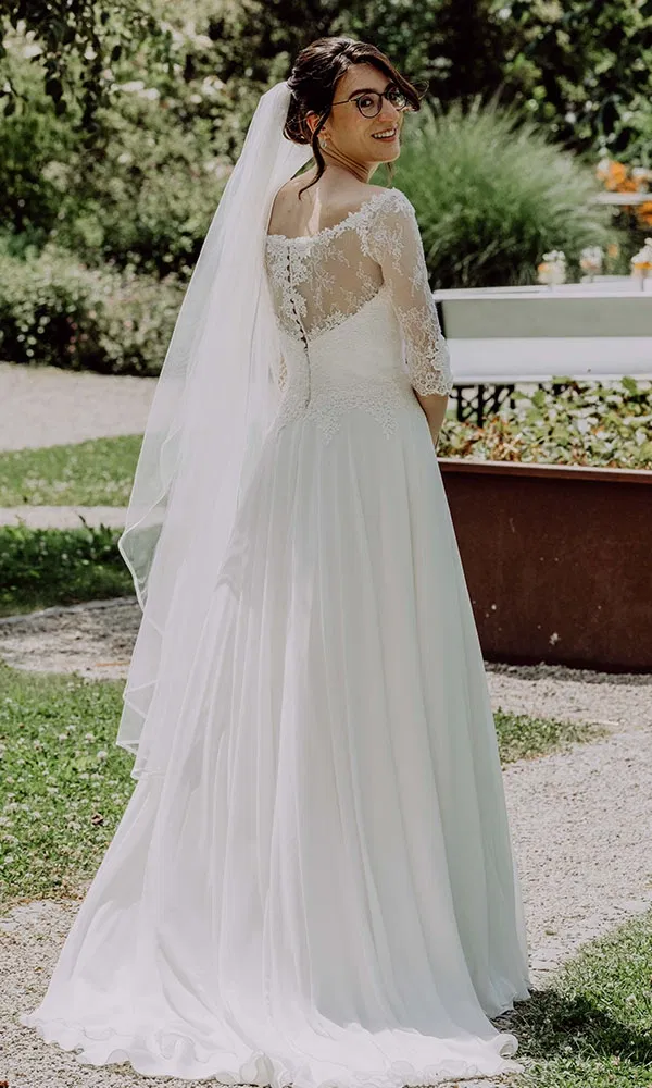 „Tatsächlich war es keine Liebe auf den ersten Blick“, erzählt Maria. Sie suchte ihr Kleid in München bei Kleider machen Bräute, einem Geschäft, das Second-Hand- und nachhaltige Mode anbietet. Es blieb auch das einzige Atelier, das sie besuchte. Ihr Plan: verschiedene Stile anprobieren, um herauszufinden, was ihr wirklich steht. „Man hat ja oft eine Vorstellung im Kopf, weiß aber gar nicht, ob das an einem selbst gut aussieht“, sagt sie. Ein Wunsch stand jedoch fest: lange oder zumindest längere Ärmel. Im Geschäft probierte Maria mehrere Modelle an und am Ende blieben zwei Kleider in der engeren Wahl. Eines mit Spaghettiträgern und zartem Blumenmuster, das andere mit Spitze und Ärmeln. „Ich konnte mich überhaupt nicht entscheiden“, erinnert sie sich. Also schlief sie eine Nacht darüber, rief am nächsten Morgen wieder an und reservierte ihr Kleid. Und welches wurde es? Maria beschreibt es so: „Ein bodenlanges Kleid mit einer leichten Schleppe – nicht zu lang. Es hatte einen Carmen-Ausschnitt, Spitzenoberteil und dreiviertellange, eher enganliegende Ärmel.“ Der Rock war in A-Linie geschnitten, aus fließendem Tüll, elegant und schlicht zugleich.