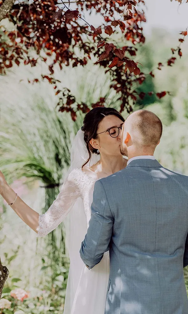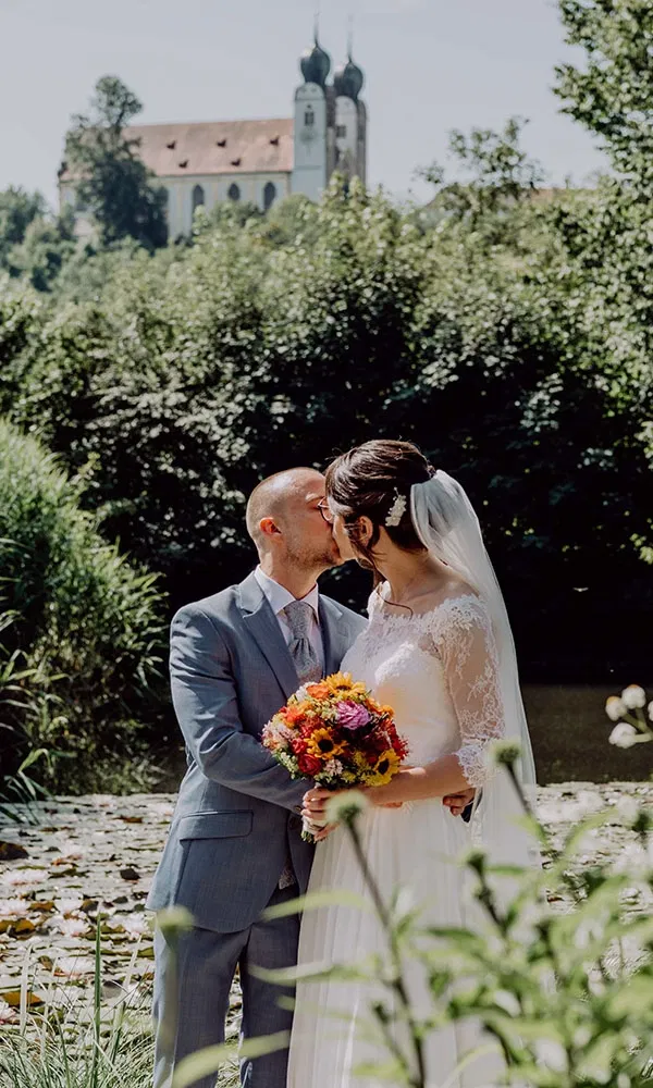 Maria und Bene entschieden sich, ihre Liebe gleich zweimal zu feiern: zuerst im kleinen Kreis, später mit all ihren Liebsten. Ihre standesamtliche Hochzeit fand im Juli 2023 auf der Herreninsel statt – ein Ort, dessen Termine heiß begehrt sind. „Am 2. November werden dort jedes Jahr die neuen Trauungstermine freigegeben“, erzählt Bene. „Wir haben wirklich lange probiert, überhaupt durchzukommen.“ Doch schließlich hatten sie Glück und sicherten sich ihren Wunschslot. Für die Feier auf der Herreninsel luden sie nur den engsten Familienkreis ein: Eltern, Geschwister und ihre Trauzeugen. „Wir waren ungefähr 20 Leute“, sagt Maria. Ein besonders rührender Moment: Ein paar von Benes Freunden erschienen völlig überraschend zum Spalierstehen. „Das wussten wir gar nicht. Das war so eine schöne Überraschung.“ Nach der Trauung ging es weiter auf die Fraueninsel, wo sie gemeinsam essen und den Tag entspannt ausklingen ließen. Die große Feier folgte ein Jahr später: Dann heirateten Maria und Bene kirchlich – diesmal mit rund 80 Gästen. Die Trauung fand in der Kirche auf der Baumburg statt. Gefeiert wurde anschließend in der „Angermühle“ im Ort Altenmarkt an der Alz.