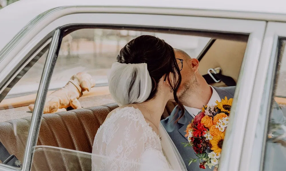 Eine besondere Entscheidung trafen Maria und Bene bei der kirchlichen Trauung: „Das Einzige, das wirklich feststand, waren die Sonnenblumen in der Kirche“, erzählt Maria. „Diese hellen, kräftig gelben Blüten fand ich einfach wunderschön.“ Die Sonnenblumen schmückten den Mittelgang und setzten warme, fröhliche Akzente. Ansonsten entschieden sich die beiden bewusst für eine bunte, vielfältige Blumenauswahl. „Wir hatten kräftige Farben und haben vor allem darauf geachtet, dass alles harmonisch zusammenpasst“, erklärt Maria.