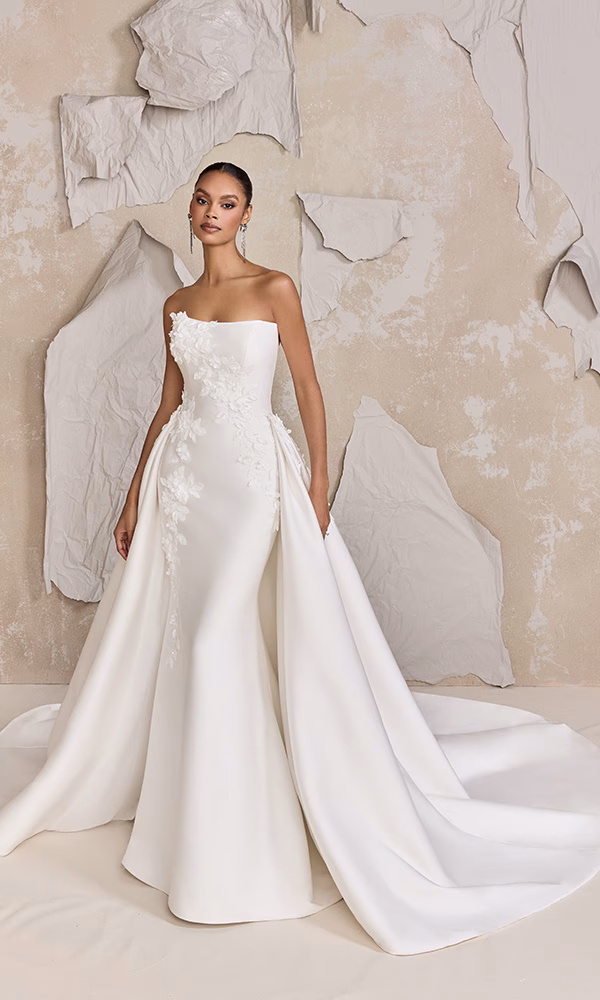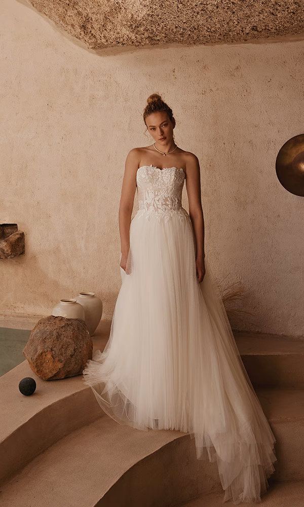 Im Herzen des Frühlings, wenn Blüten erwachen und Liebe in der Luft liegt, feiert die neueste Kollektion die Essenz zeitloser Eleganz. Die Muse? Die Braut – Symbol für Anmut, Ausstrahlung und stilvollen Charme. Jedes Modell der Kollektion L’Etoile ist meisterhaft gefertigt, um die Braut ins Rampenlicht ihrer eigenen Liebesgeschichte zu stellen. Während sie den Gang entlang schreitet, gilt ihr alle Aufmerksamkeit. Durch exzellente Schneiderkunst verschmelzen schlichte Ästhetik und detailreiche Highlights. Dezente Eleganz wird durch filigrane Spitzenakzente und 3D-Blütenapplikationen neu interpretiert. Große modische Statements entstehen durch kunstvolle Schleppen, verführerische Beinschlitze und luxuriöse Perlenverzierungen.