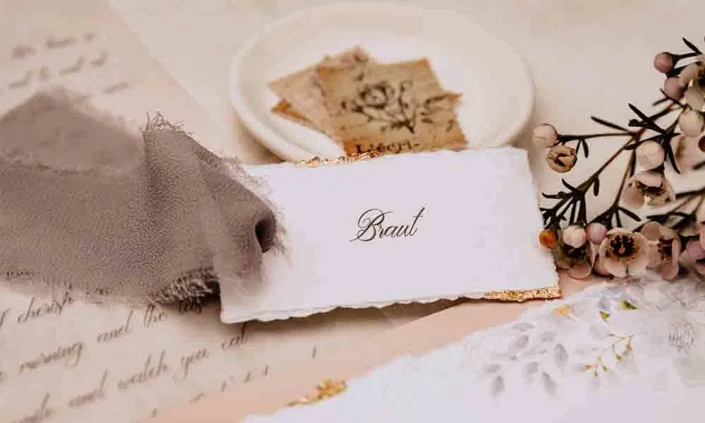 Zwischen feinsten Stoffschuhen, zarten Blüten und romantischer Papeterie liegt ein Liebesbrief, der zu Tränen rührt. Gemeint ist das Eheversprechen – persönlich formuliert, mit Herz und Handschrift festgehalten.