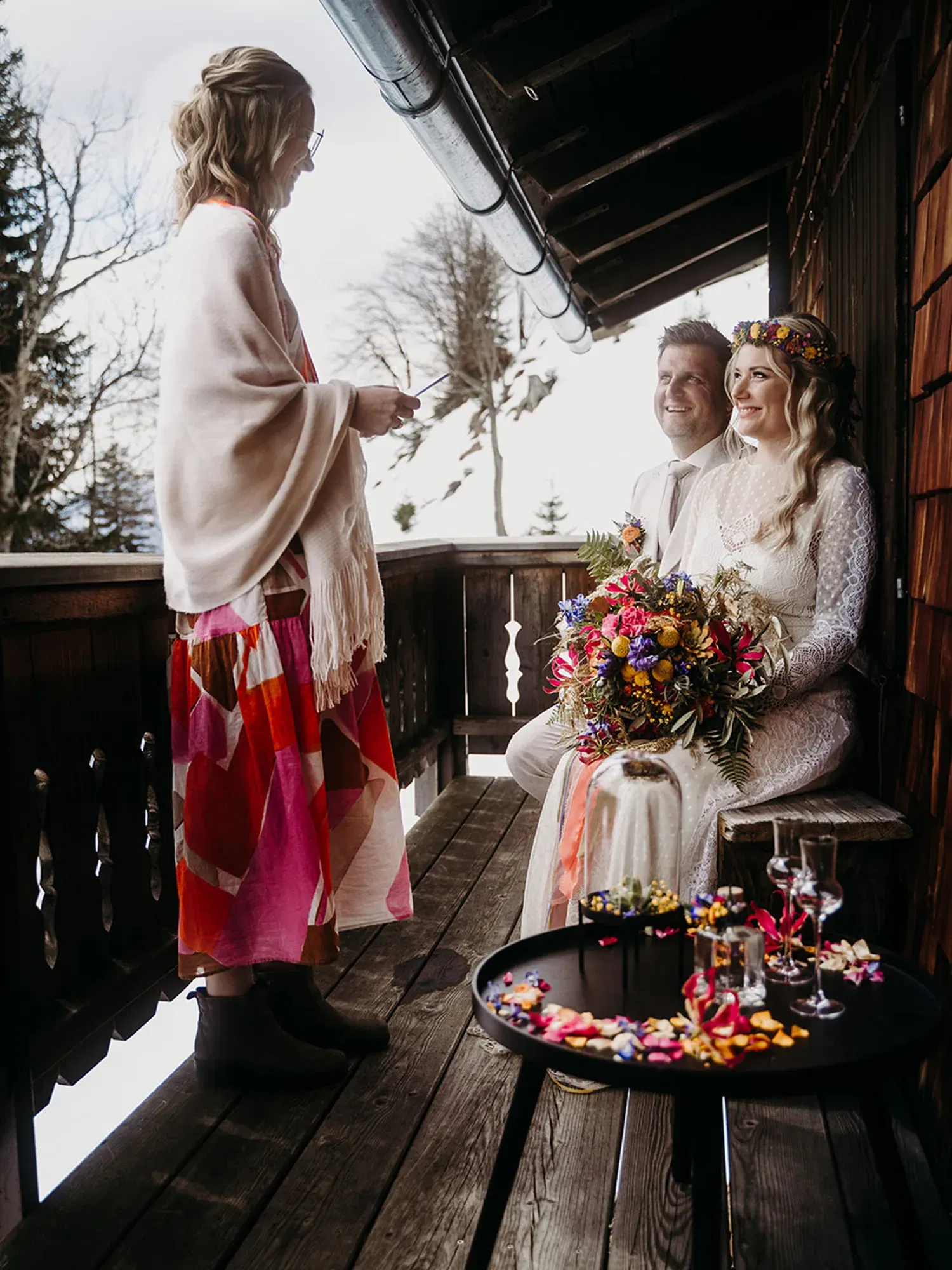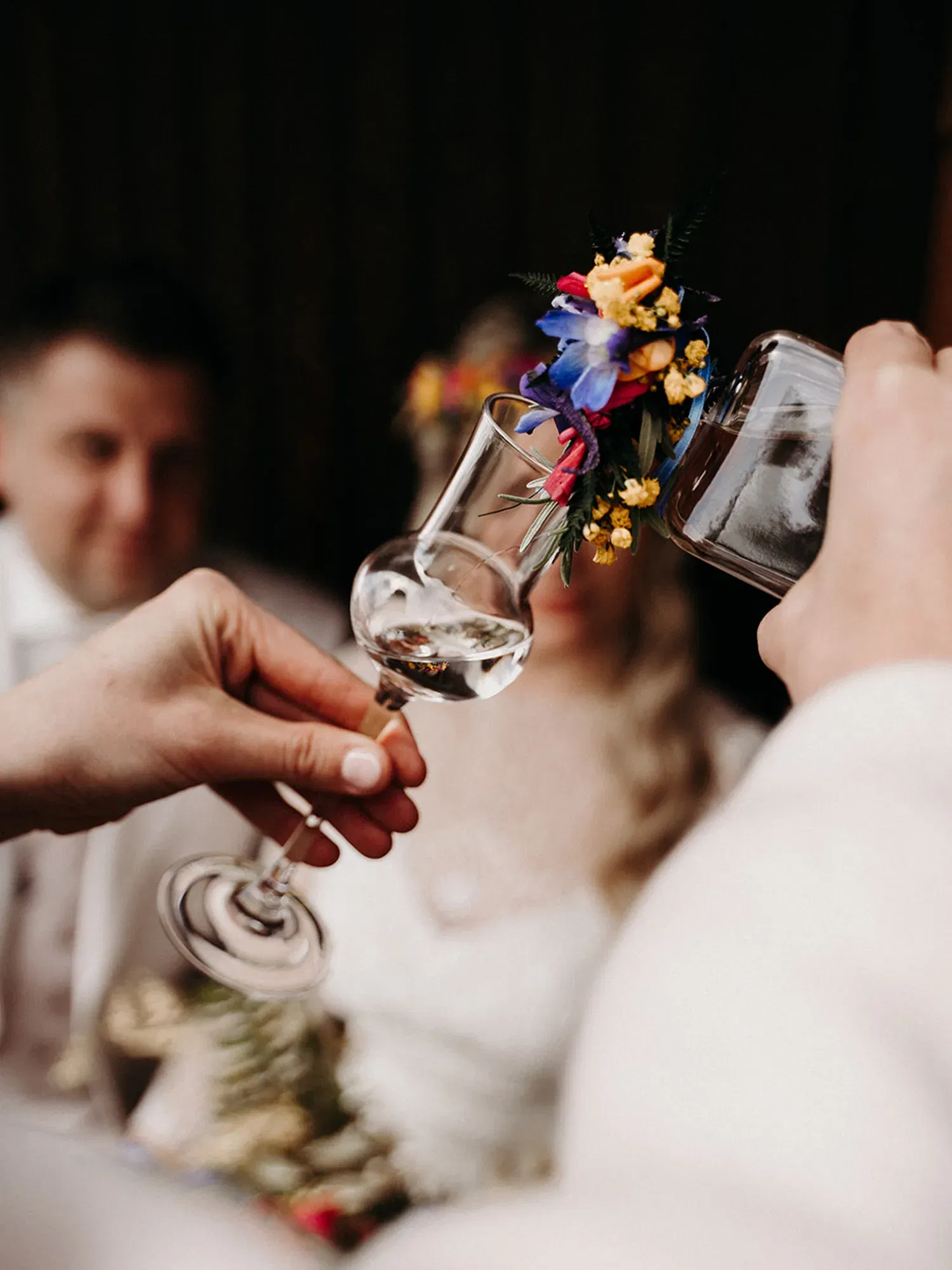 Zu einer rundum perfekten Hochzeit im Schnee gehört ein passendes Hochzeitsmenü. Hierfür eignen sich winterlich-deftige Gerichte, Gewürze wie Ingwer, Zimt und Nelken und ein Hochzeitsempfang mit dampfendem Punsch oder Glühwein zum Aufwärmen. Wie wäre es außerdem mit einer Whiskey- oder Hot Chocolate-Bar als schöne Alternative zum klassischen Sweet Table?