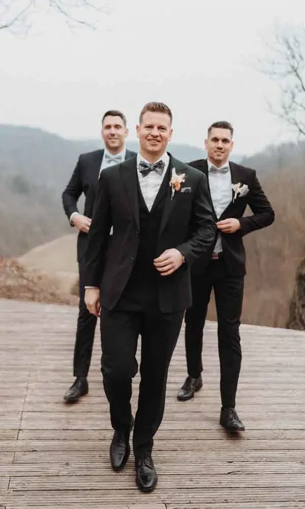 Zum Brautkleidkauf ging Katharina zu Tara in Stuttgart. Dort war bereits ihre Schwester als Braut fündig geworden. Als Katharina der Verkäuferin ihre Vorstellungen von einem romantischen Stil mit langen Ärmeln schilderte, hatte diese sofort ein Modell im Kopf. „Das war ein Volltreffer!“, freut sich die Braut. „Rosalie“ von Ria Tener fühlte sich für Katharina einfach perfekt an. Für Steffen kam als Anlaufstelle nur Mr. Ash in Stuttgart infrage. „Dort kann man sich seinen Anzug bis ins kleinste Detail selbst zusammenstellen. Von der großen Auswahl war ich fast überfordert“, lacht er. Mit dem Ergebnis war der Bräutigam mehr als zufrieden.