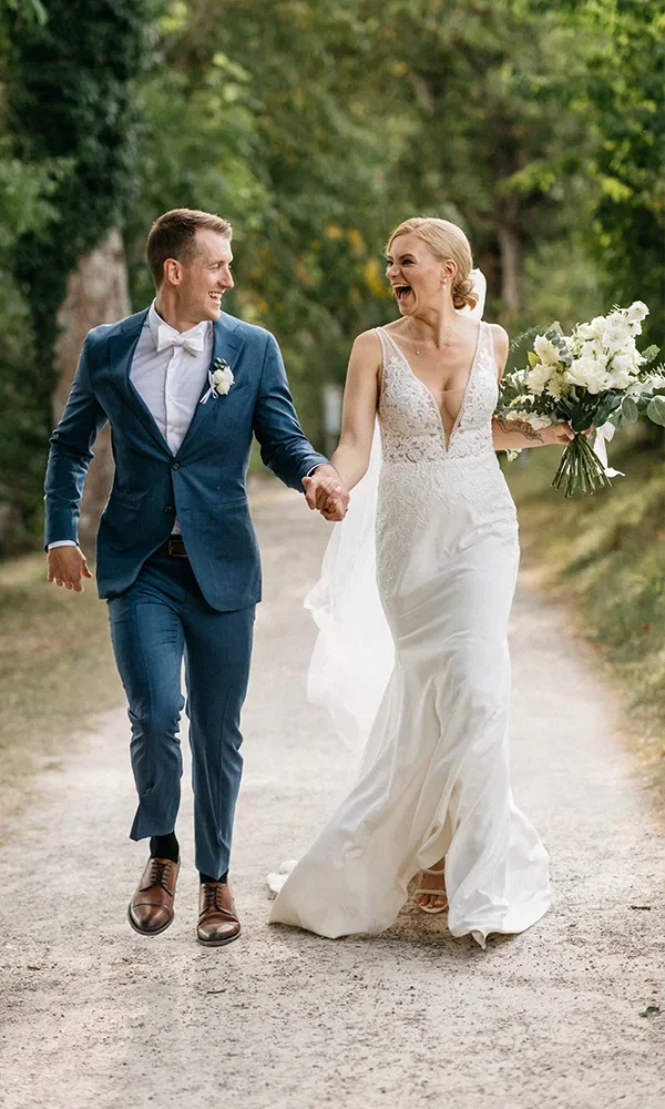„Am Anfang unserer Hochzeitsplanungen stand die Frage: Welche drei Punkte sind uns am wichtigsten? Wir entschieden uns für Fotos, Essen und Musik. Dafür wollten wir am meisten ausgeben. Posten wie Dekoration, Blumen oder besonderes Geschirr waren uns nicht so wichtig. Die Einladungskarten ließen wir nur für unseren engsten Kreis drucken. Der Großteil unserer Gäste erhielt unsere Einladung digital. Wir fokussierten uns auf unsere drei wichtigsten Dinge: Da die Hochzeitsfotos für die Ewigkeit bleiben, gehörten sie unbedingt dazu. Essen und Musik tragen entscheidend zu guter Stimmung bei. Deshalb waren das unsere zwei weiteren priorisierten Punkte. Wir sind superhappy mit unseren Entscheidungen und würden alles genauso wieder machen.“