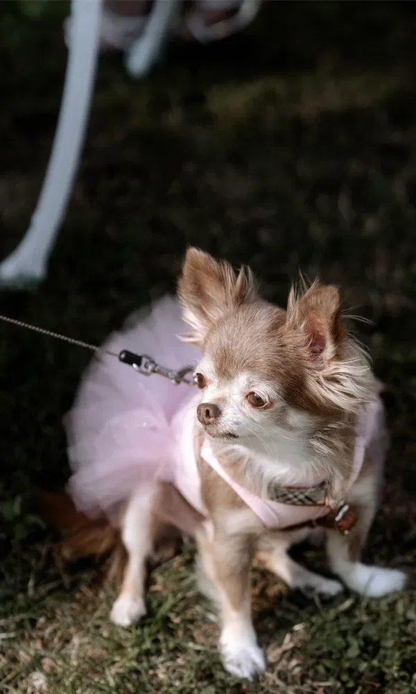 Nicht nur die Gäste erschienen schick gekleidet – auch ein ganz besonderer, kleiner Ehrengast sorgte für Aufsehen: der Chihuahua von Yanas Eltern. Da Yanas Schwester gerade in Südkorea unterwegs war, brachte sie der Hündin ein eigenes Outfit mit – ein rosafarbenes Tütü. Ein tierisch süßer Hingucker auf der Feier!